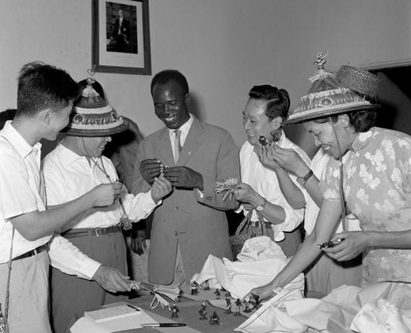 中非人民友好協會代表團在1961年2月24日到6月19日的四個月中,訪問了幾內亞、馬里、加納、尼日爾等八個西非國家。圖為非洲朋友向代表團贈送禮品。(新華社記者孟憲全攝)