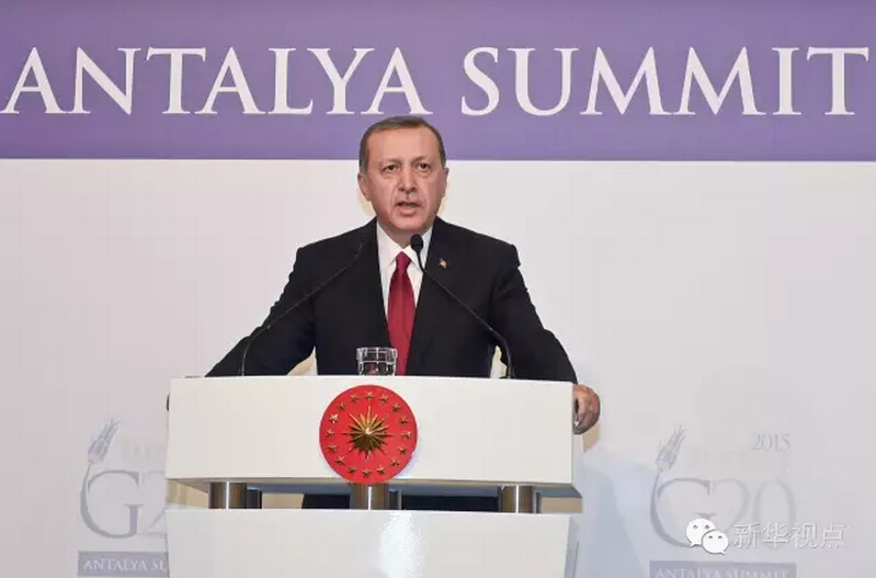 ??? 2015年11月,G20峰會在土耳其安塔利亞舉行,從安塔利亞到杭州,從地中海岸到錢塘江畔,與東道主接力棒一樣順利傳遞的,是對推動全球經(jīng)濟穩(wěn)步復蘇、實現(xiàn)可持續(xù)增長的決心。“接棒”后的中國,在議題設置上既汲取了安塔利亞峰會的智慧成果,又著眼當前、旨在長遠、彰顯新意。 2015年G20安塔利亞峰會上的埃爾多安總統(tǒng)↓