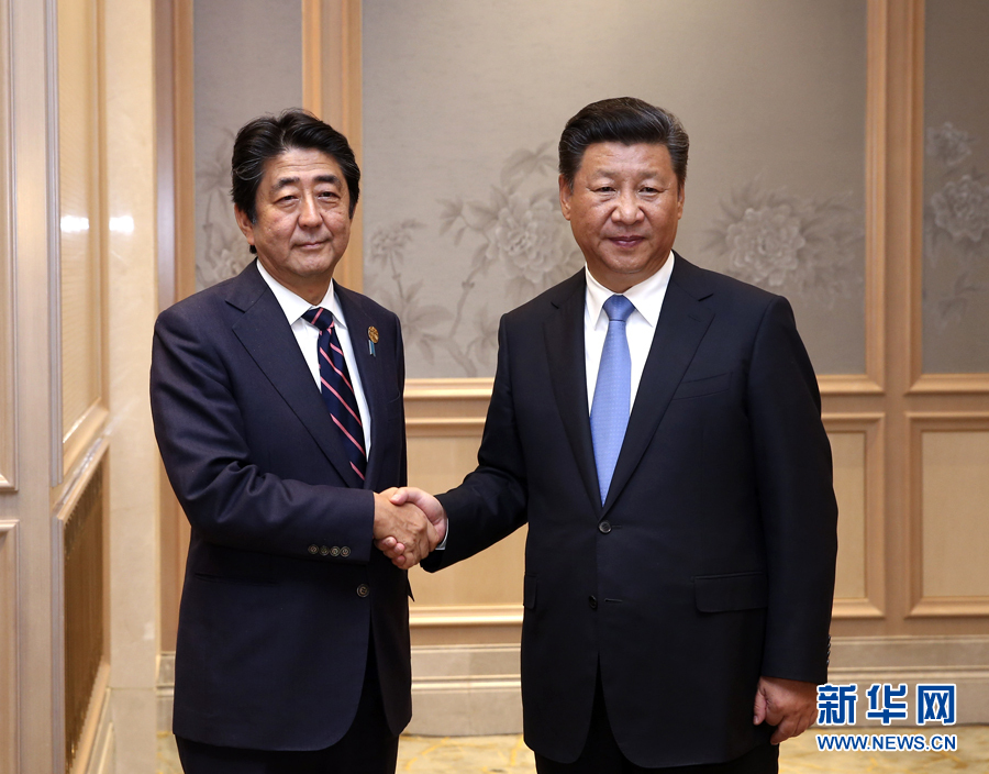 9月5日,國家主席習近平在杭州會見來華出席二十國集團領導人峰會的日本首相安倍晉三。 新華社記者龐興雷攝