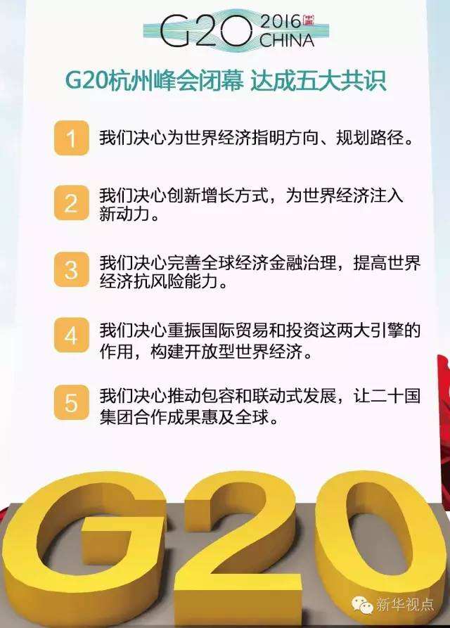 從4日下午,習近平主席敲下木槌,宣布峰會開幕,至5日下午峰會閉幕。一天半的時間,領導人在峰會上圍繞會議主題和重點議題進行了熱烈而富有成果的討論,就加強政策協調、創新增長方式,全球經濟金融治理,國際貿易和投資,包容和聯動式發展等議題,以及影響世界經濟的其他突出問題,深入交換看法,達成許多重要共識。