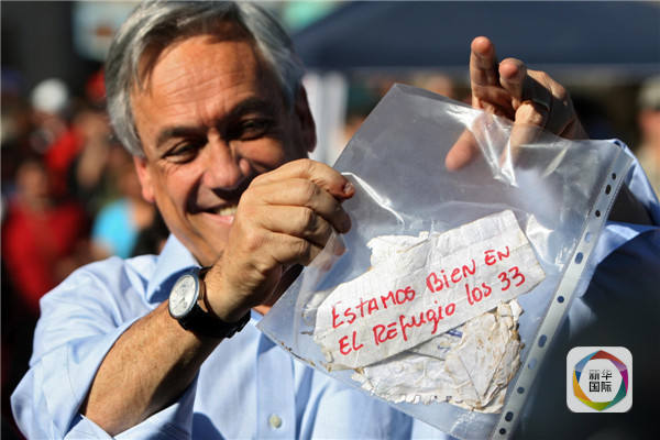 事故發生后第二天,時任智利總統皮涅拉承諾,政府將“竭盡全力”營救被困礦工。8月22日,經過17天的鉆探搜尋,地面通往井下的生命通道被打通。鉆頭縮回后,礦工奧赫達傳回地面的字條立刻傳遍了世界:我們33人都在庇護所內,全部安好。