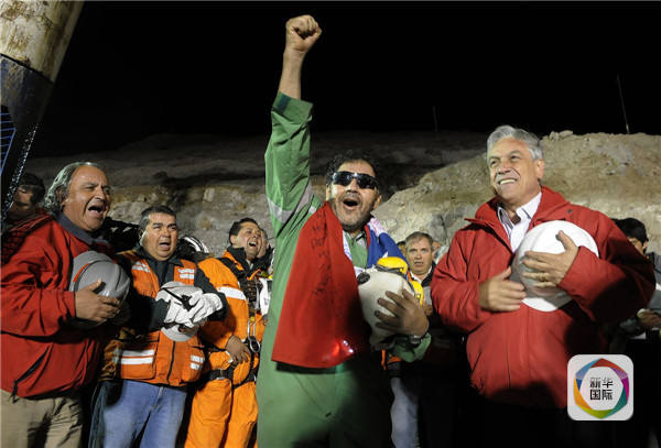 2010年10月13日,最后一名被困礦工路易斯·烏爾祖阿(中)成功升井后與皮涅拉(右)一同慶祝。(新華社發)