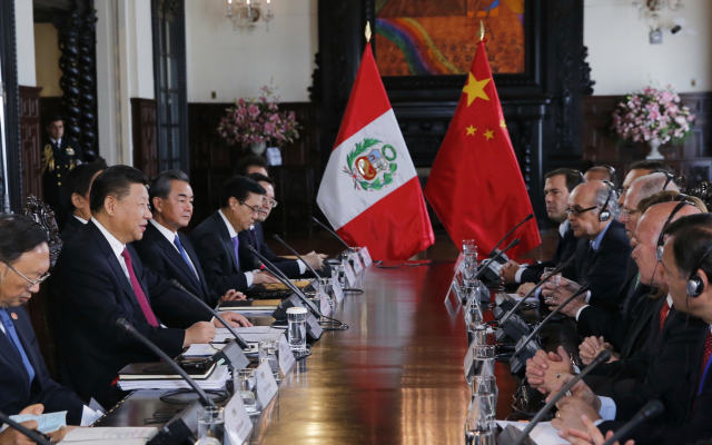 11月21日,國(guó)家主席習(xí)近平在利馬同秘魯總統(tǒng)庫琴斯基舉行會(huì)談。(新華社記者 鞠鵬 攝)