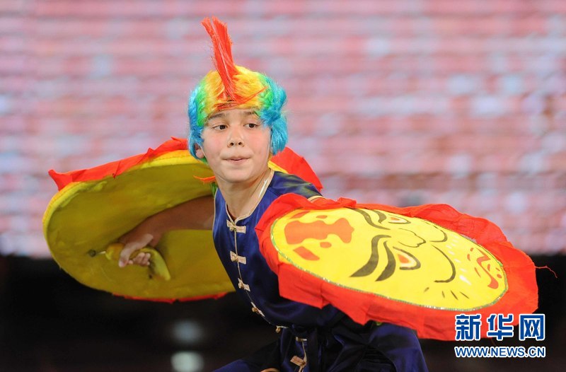 1月18日晚,烏茲別克斯坦首都塔什干人民友誼宮,烏茲別克斯坦中華民族文化中心武術隊隊員在表演武術。