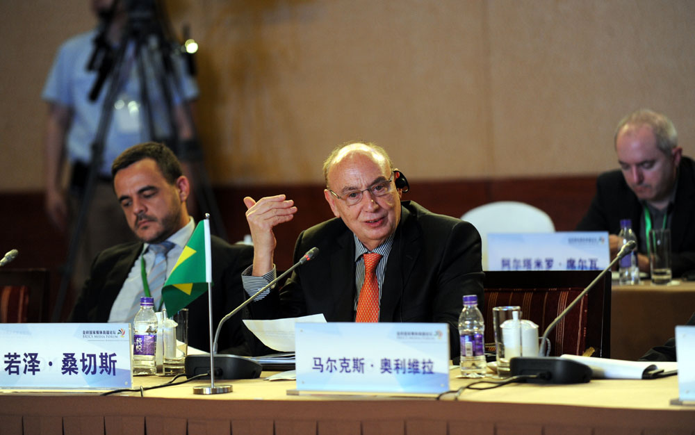 金磚國家媒體高端論壇開幕式6月8日在北京舉行。圖為論壇共同主席、巴西金融資訊集團總裁若澤·桑切斯發表講話。 新華網 孫韜 攝