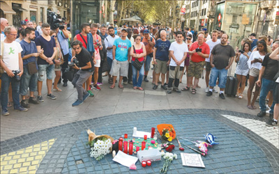 西班牙巴塞羅那恐襲事件后,受害者家屬紛紛在蘭布拉斯大街舉行悼念活動,街上行人自發停下腳步表示哀悼和慰問。記者 王 迪攝