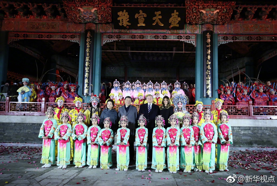 新華網北京11月8日電? 國家主席習近平和夫人彭麗媛8日下午在故宮暢音閣與來華進行國事訪問的美國總統特朗普和夫人梅拉尼婭共同欣賞京劇表演。兩國元首夫婦觀看了《梨園春苗》《美猴王》《貴妃醉酒》三個精彩劇目。來賓們陣陣掌聲和聲聲喝彩不絕于耳。演出結束后,兩國元首夫婦同參加演出的演員們合影。(攝影:蘭紅光;文字:孫奕 據新華社“新華視點”微博報道)