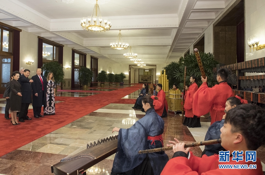 11月9日,國家主席習近平在北京人民大會堂東門外廣場舉行歡迎儀式,歡迎美利堅合眾國總統唐納德·特朗普對中國進行國事訪問。這是習近平和夫人彭麗媛同特朗普夫婦在人民大會堂欣賞文藝表演。新華社記者 李學仁 攝