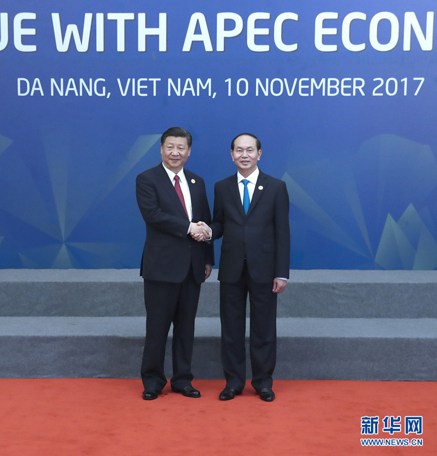 11月10日,國家主席習近平在越南峴港出席亞太經合組織領導人同工商咨詢理事會代表對話會。這是對話會開始前,習近平受到越南國家主席陳大光的迎接。新華社記者 馬占成 攝
