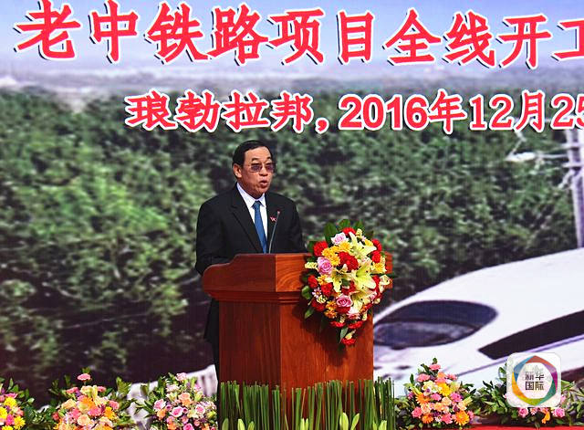 2016年12月25日,老中鐵路項目全線開工儀式在老撾瑯勃拉邦舉行,老撾公共工程與運輸部部長奔占·辛塔馮在開工儀式上致辭。(新華社發)