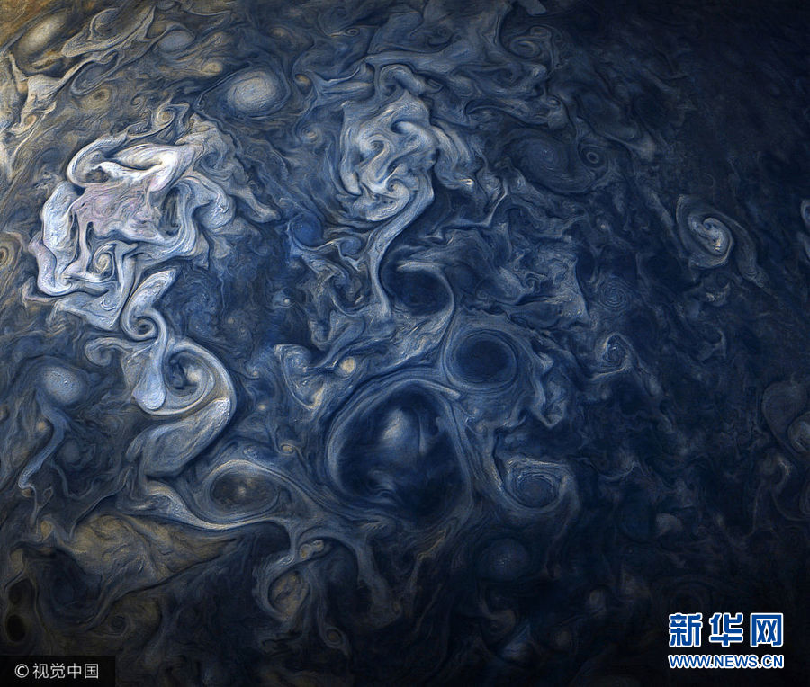 12月21日訊(具體拍攝時間不詳),這一系列由木星探測器“朱諾”號帶來的高清圖,錯綜復雜的星云結構看上去就像印象派大師的畫作。(圖片來源:視覺中國)