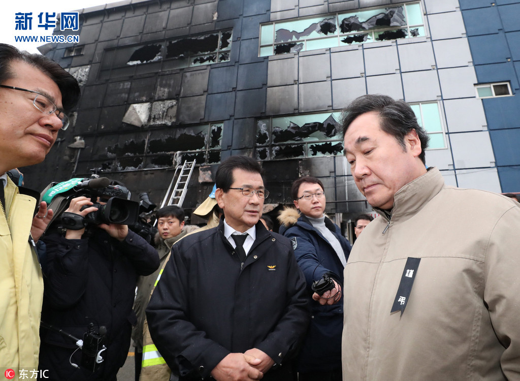 12月23日,韓國忠清北道堤川市,韓國總理李洛淵視察運動中心火災現場。據報道,21日,韓國忠清北道堤川市一運動中心發生火災,造成29死29傷,其中20名死者在火災發生時位于大樓2層的桑拿房內。近日,韓媒公布了火災現場的一組照片。照片顯示,桑拿房堆積了各種洗浴用品,應急出口幾乎被封死。(圖片來源:東方IC)