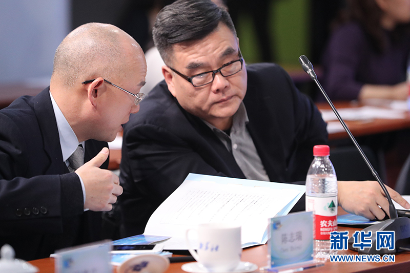 12月26日,新華網第八屆“縱論天下”國際問題研討會在北京舉行。外交學院教授、《外交評論》執行主編陳志瑞(左)與中國國際問題研究院歐洲研究所所長崔洪建(右)在交流。新華網 郭小天 攝