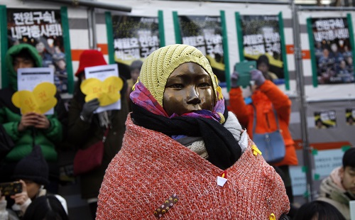 資料圖:在韓國首都首爾,民眾為“慰安婦”少女像戴上了帽子和圍巾。新華社記者姚琪琳 攝