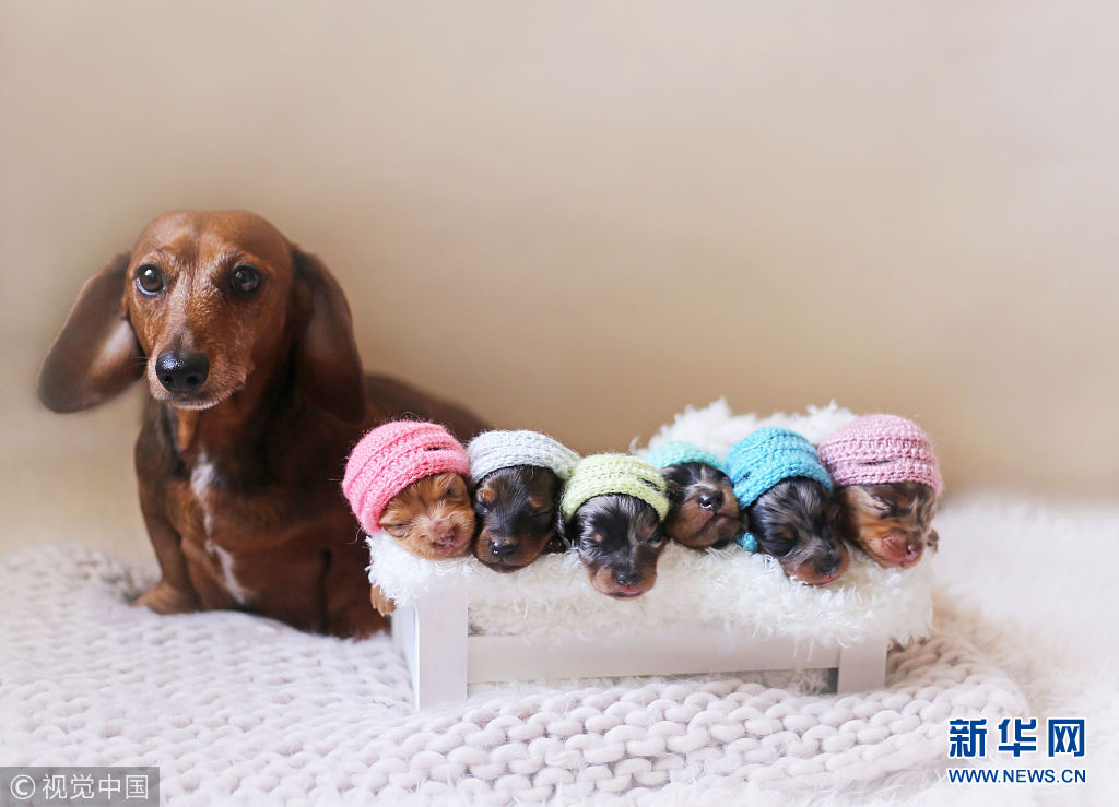 2016年6月12日消息(具體拍攝時間不詳),美國德克薩斯州麥卡倫市,商業攝影師Belinda Schenk為一對臘腸犬和他們剛出生的6只寶寶拍了一組別出心裁的唯美寫真。(圖片來源:視覺中國)