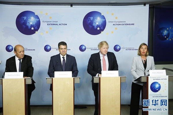 當(dāng)天在與伊朗外長(zhǎng)扎里夫舉行會(huì)談后,莫蓋里尼、法國外長(zhǎng)勒德里安、德國外長(zhǎng)加布里爾和英國外交大臣約翰遜舉行發(fā)布會(huì),強(qiáng)調(diào)了歐方的這一立場(chǎng)。