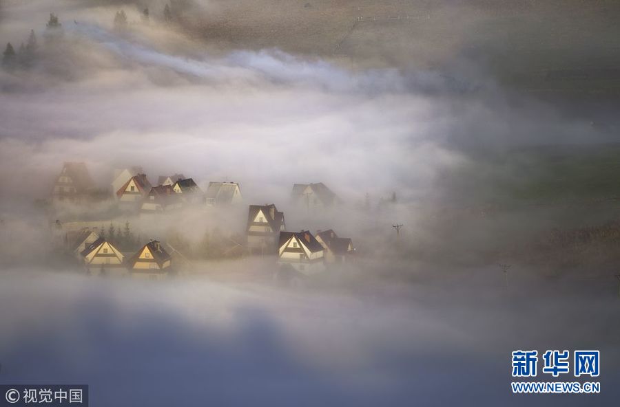1月10日訊(具體拍攝時間不詳),波蘭皮耶尼內山脈的一個村莊被濃霧籠罩,攝影師站在對面山上拍攝的景觀如童話世界一般,色彩繽紛的房子在濃霧中若隱若現仿若仙境。(圖片來源:視覺中國)