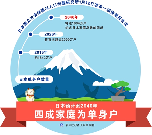 新華社東京1月13日電(記者華義)日本國立社會保障與人口問題研究所12日發(fā)布一項預測報告說,到2040年日本單身戶將占日本家庭總數的約四成。日本老齡化和獨居現象日益加劇。