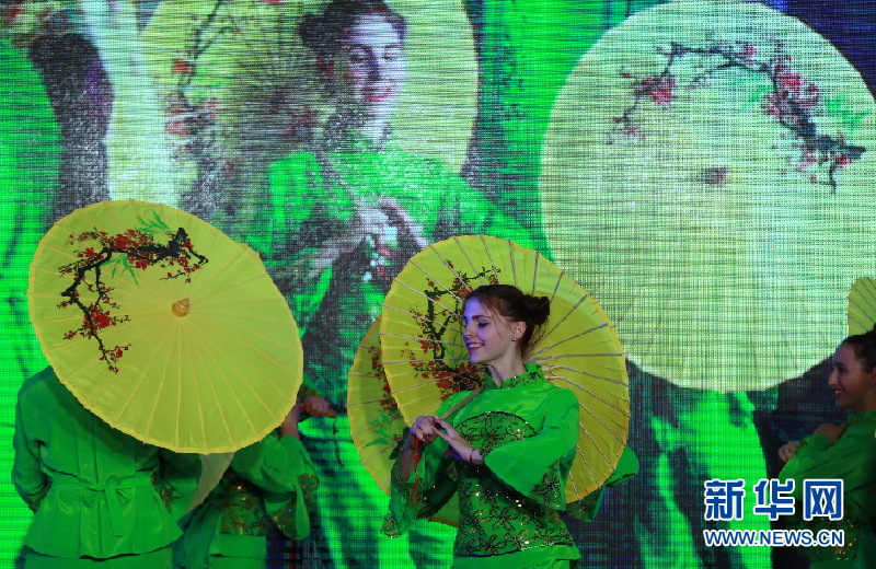 1月23日,烏克蘭基輔第一東方語言學校的學生表演傘舞。新華網發(陳俊鋒攝)