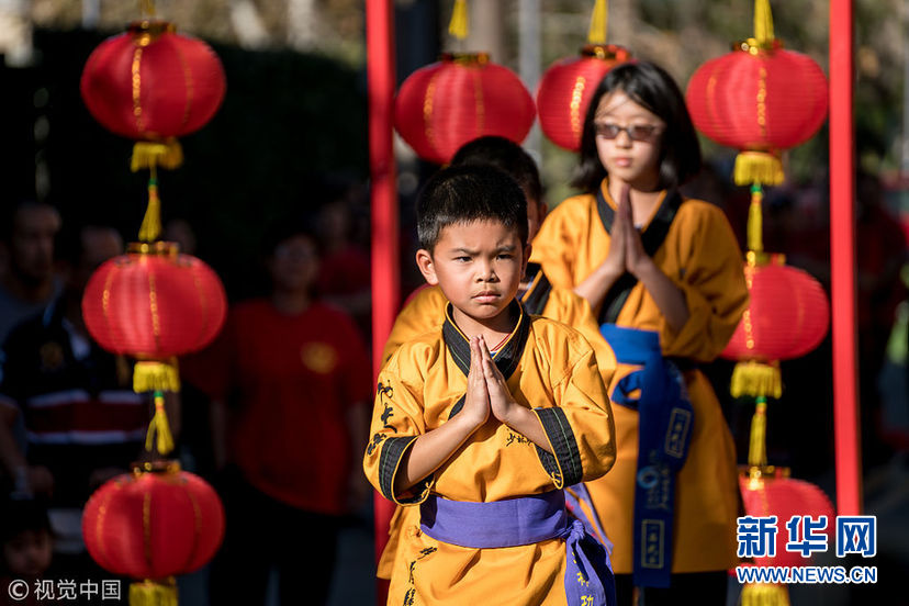 當地時間1月28日,美國洛杉磯,當地Grove商場舉行少林武術表演以及其他中國文化類的演出,慶祝傳統新年,場外攤位還有傳統剪紙,捏面人,糖畫,彩繪等項目。圖為少林功夫表演。(圖片來源:視覺中國)