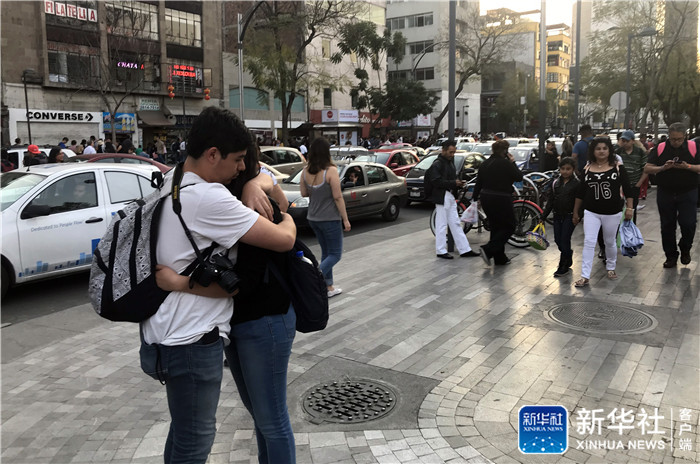 2月16日,人們在墨西哥首都墨西哥城一商場前的廣場避險。新華社記者許睿攝
