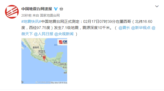 新華社快訊:中國地震臺網正式測定:2月17日7時39分,在墨西哥(北緯16.60度,西經97.75度)發生7.1級地震,震源深度10公里。