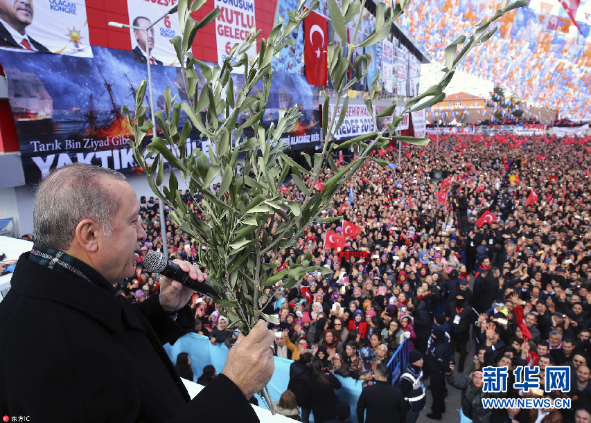 當地時間2018年2月17日,土耳其埃斯基謝希爾,土耳其總統埃爾多安出席正義與發展黨集會,手持橄欖枝發表講話。(圖片來源:東方IC)