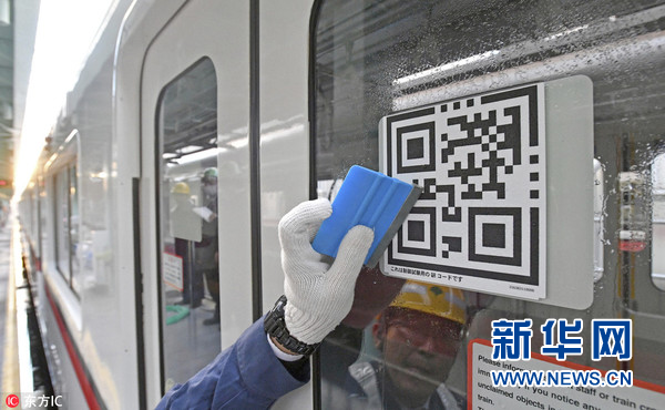 2017年11月24日,日本東京,地鐵列車門上的二維碼,一旦乘客發現任何異常,可通過掃描二維碼來通知地鐵工作人員。