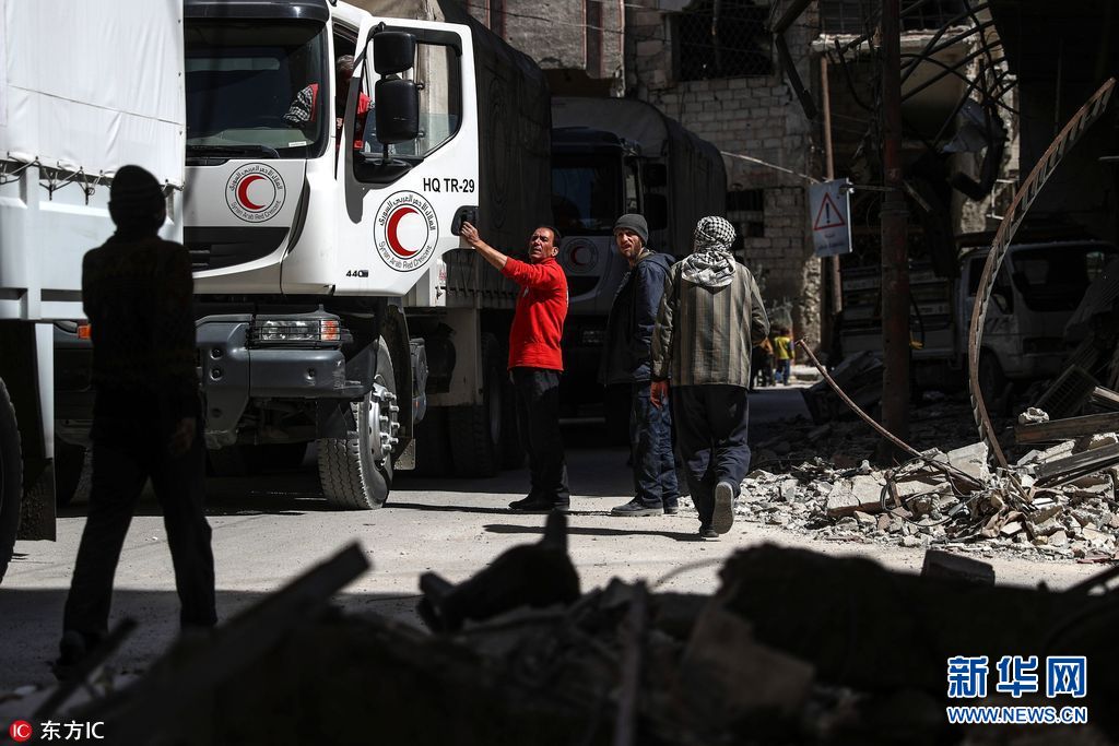 當地時間2018年3月9日,敘利亞,推遲多日后,人道主義救援物資進入東古塔反政府武裝控制區并完成卸貨,共13卡車物資當天上午從瓦菲丁通道進入杜馬區。(圖片來源:東方IC)