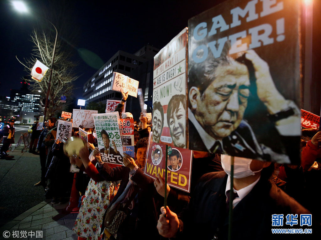 3月12日,日本東京,日本民眾在首相府邸前游行抗議。安倍晉三此前就森友學園丑聞事件的文件被篡改一事道歉。(圖片來源:視覺中國)