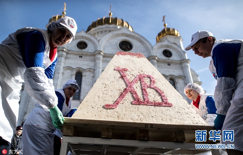 當地時間2018年4月8日,俄羅斯莫斯科,為慶祝東正教復活節,莫斯科救世主大教堂前現一個1141公斤的傳統復活節蛋糕,打破吉尼斯世界紀錄。(圖片來源:東方IC