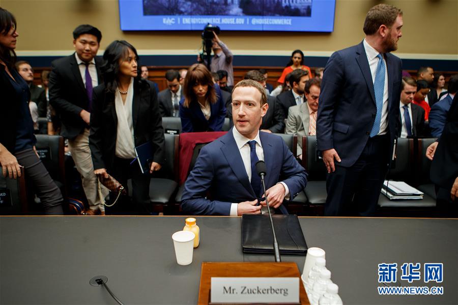 4月11日,在美國(guó)華盛頓,美社交媒體平臺(tái)臉書公司首席執(zhí)行官馬克·扎克伯格出席眾議院聽證會(huì)。新華社發(fā)(沈霆攝)
