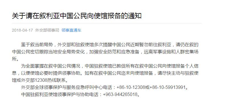 中國駐敘利亞使館領(lǐng)事保護與協(xié)助電話:+963-944265018。
