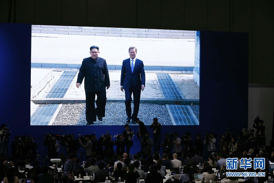 新華社快訊:朝鮮最高領導人金正恩27日上午在板門店跨過軍事分界線,與韓國總統文在寅會晤。