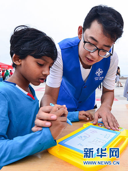 5月4日,在馬爾代夫首都馬累市中心停機坪廣場,中國志愿者教當地兒童寫漢字。新華社發(杜才良 攝)