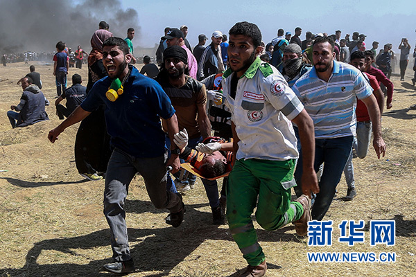 5月14日,在加沙城以東的加沙地帶與以色列交界地區,人們轉移一名在沖突中受傷的巴勒斯坦示威者。新華社發