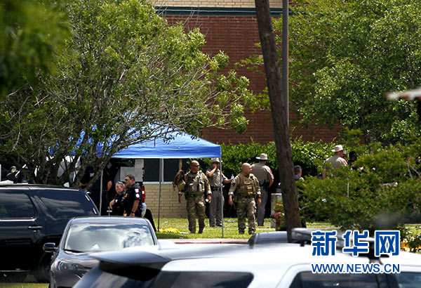 5月18日,在美國得克薩斯州加爾維斯頓郡圣菲市,安全人員在發生槍擊的圣菲高中周圍警戒。新華社發(宋穹 攝)