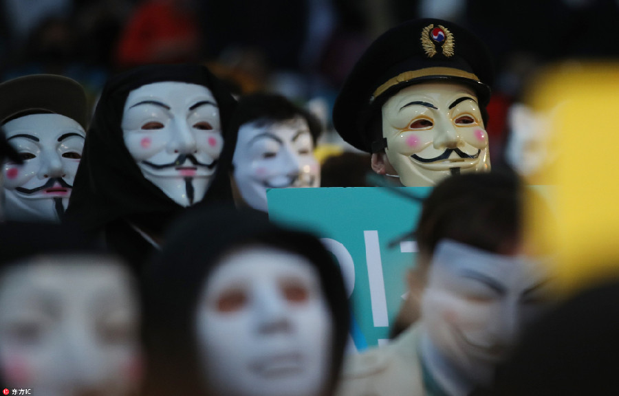 當?shù)貢r間2018年5月18日,韓國首爾,大韓航空有限公司的飛行員戴著蓋伊·福克斯面具,在首爾市區(qū)集會抗議,反對大韓航空會長兼首席執(zhí)行官趙亮鎬及其家庭。