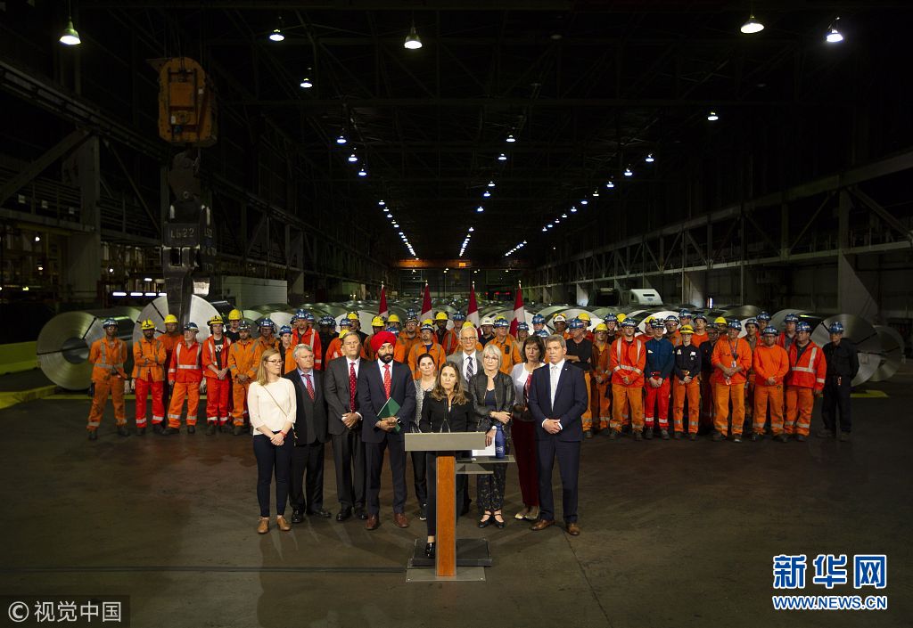 當(dāng)?shù)貢r間2018年6月29日,加拿大漢密爾頓,加拿大外交部長弗里蘭、經(jīng)濟發(fā)展部長貝恩斯和勞工部長哈伊杜造訪斯特爾科鋼鐵公司,并共同宣布從7月1日起,加拿大將對約126億美元從美國進(jìn)口的商品加征關(guān)稅,以報復(fù)特朗普政府對加拿大鋼鋁產(chǎn)品加征關(guān)稅。他們還表示,加拿大政府將向本國鋼鋁產(chǎn)業(yè)和制造業(yè)提供約15億美元財政援助。(圖片來源:視覺中國)