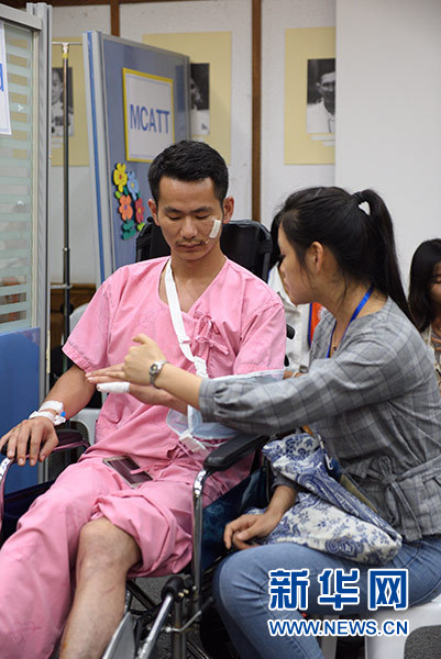 7月9日,在泰國普吉島的哇集拉醫院,一名華人志愿者(右)指導中國受傷游客活動手指關節。新華社記者 秦晴 攝