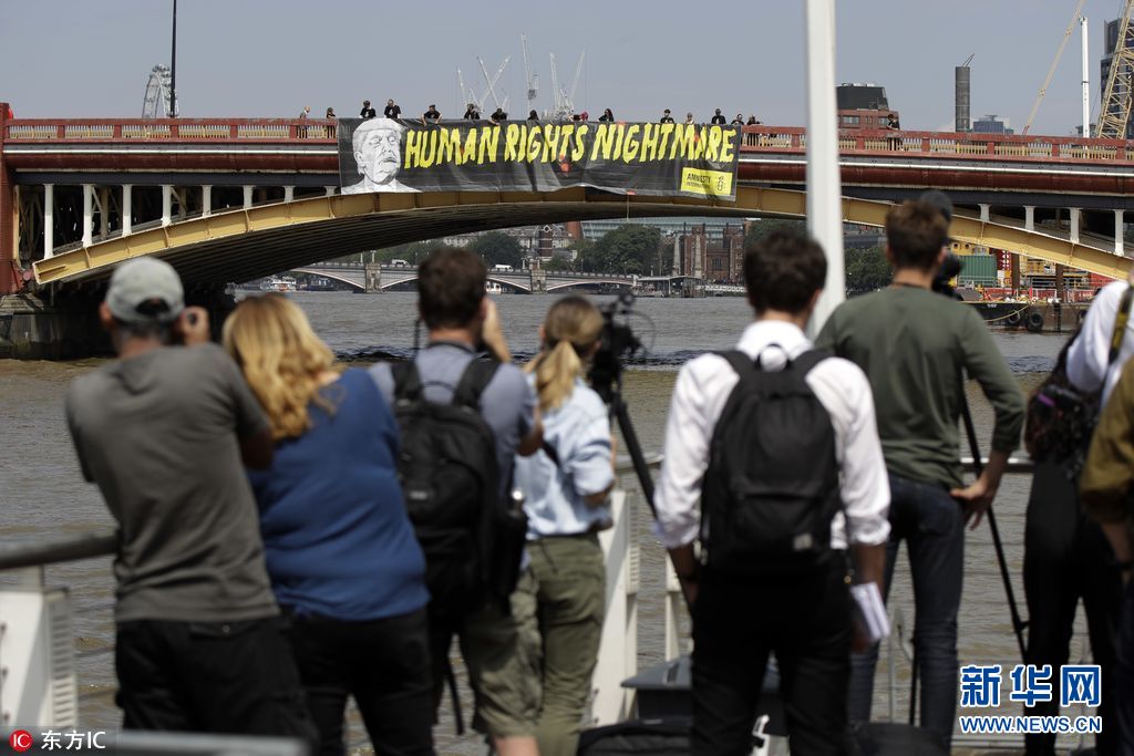 7月12日,英國倫敦,國際特赦組織成員在倫敦泰晤士河上沃克斯豪爾橋懸掛橫幅,抗議美國總統特朗普到訪英國。(圖片來源:東方IC)