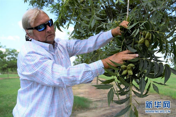 7月10日,在美國(guó)佐治亞州奧西拉,山核桃種植戶蘭迪·哈德遜在自己的種植園中展示未成熟的山核桃。 新華社記者楊承霖?cái)z