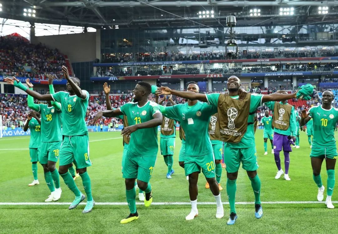 △塞內加爾男足在俄羅斯世界杯小組賽中戰(zhàn)勝波蘭,全隊慶祝勝利