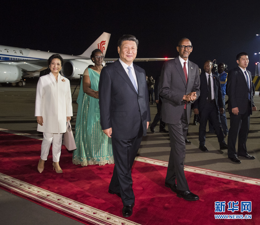 當地時間晚8時50分許,習近平乘坐的專機抵達基加利國際機場。習近平和夫人彭麗媛步出艙門,受到盧旺達總統卡加梅和夫人珍妮特等熱情迎接。盛裝的禮兵精神抖擻,向尊貴的客人行注目禮。盧旺達少年向習近平和彭麗媛獻花。卡加梅向習近平和彭麗媛介紹盧方其他迎接人員。身著靚麗民族服裝的當地民眾跳起歡快的迎賓舞,敲響喜慶的非洲鼓,熱烈歡迎中國貴賓到來。