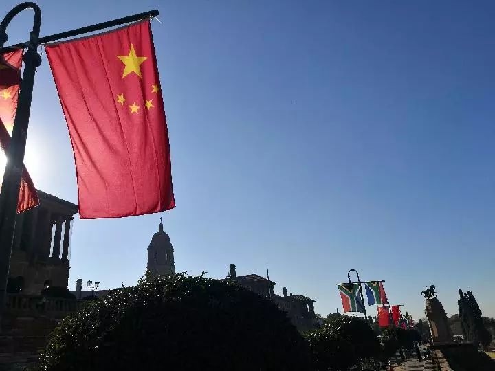 比勒陀利亞聯邦大廈廣場,草木蔥蘢。廣場旁的大道上,中國和南非兩國國旗高高掛起,迎風飄揚。