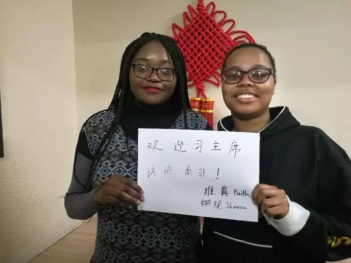“雖然中文學起來很有挑戰性,但這也恰恰是吸引我的原因。”姍妮和同伴維真向記者驕傲地展示她們書寫的漢字:歡迎習主席訪問南非!