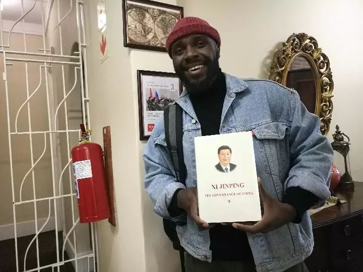 2018年7月20日,南非約翰內斯堡大學孔子學院,學院職員邦加恩向記者展示剛從圖書室借到的《習近平談治國理政》(第二卷)英文版。(新華社記者劉衛兵攝)