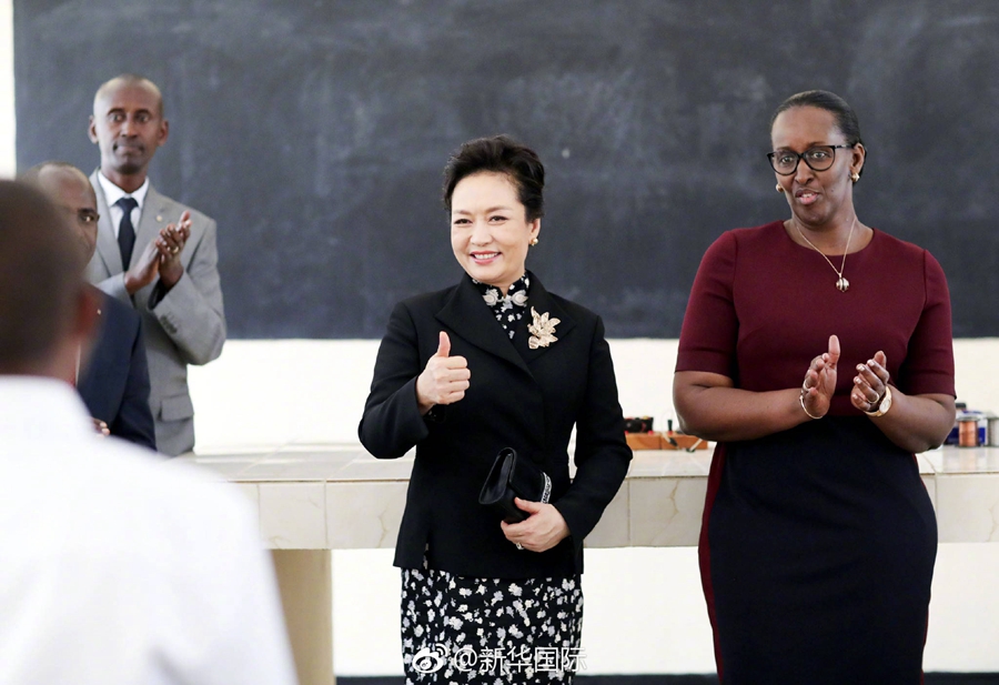 彭麗媛在盧旺達總統夫人珍妮特陪同下抵達學校,受到盧旺達教育部部長、加薩博區區長和法維女子中學校長等熱情迎接。兩名學生向兩國元首夫人獻上鮮花。彭麗媛首先參觀物理實驗室,饒有興致地觀看學生做串聯并聯電路實驗。隨后,彭麗媛來到初三年級教室,觀摩學生們上地理課。課堂上學生們關于中國地理、國情等問題的問答準確而充滿自信,彭麗媛頻頻點頭稱贊,并同同學們親切交流,鼓勵她們增加對中國的認識和了解。當彭麗媛走進學校大禮堂時,全場數百名學生起立并熱烈鼓掌,歡迎中國貴賓。彭麗媛認真欣賞學生們合唱校歌、用中文演唱中國民歌《茉莉花》并表演富有當地特色的舞蹈。之后,兩國元首夫人同學生演員們合影留念。學生代表向彭麗媛贈送手工作品,彭麗媛向校方贈送教學用品。彭麗媛表示,教育是實現國家發展、人民幸福的基礎。作為一位妻子、一位母親,我衷心希望所有的孩子特別是女孩都能夠接受良好教育,享受平等權利。希望中盧兩國加強教育交流合作,培養出更多中盧友好的使者。