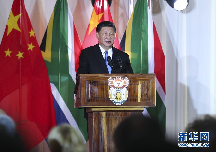 7月24日,國家主席習(xí)近平在比勒陀利亞出席南非總統(tǒng)拉馬福薩舉行的歡迎習(xí)近平主席對南非進(jìn)行國事訪問暨慶祝中南建交20周年晚宴。這是習(xí)近平發(fā)表致辭。 新華社記者 謝環(huán)馳 攝