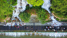 考察隊員們在“雪龍”號直升機停機坪展開五星紅旗和考察隊隊旗,組成“9北”“66度34分”等字樣,紀念進入北極圈。